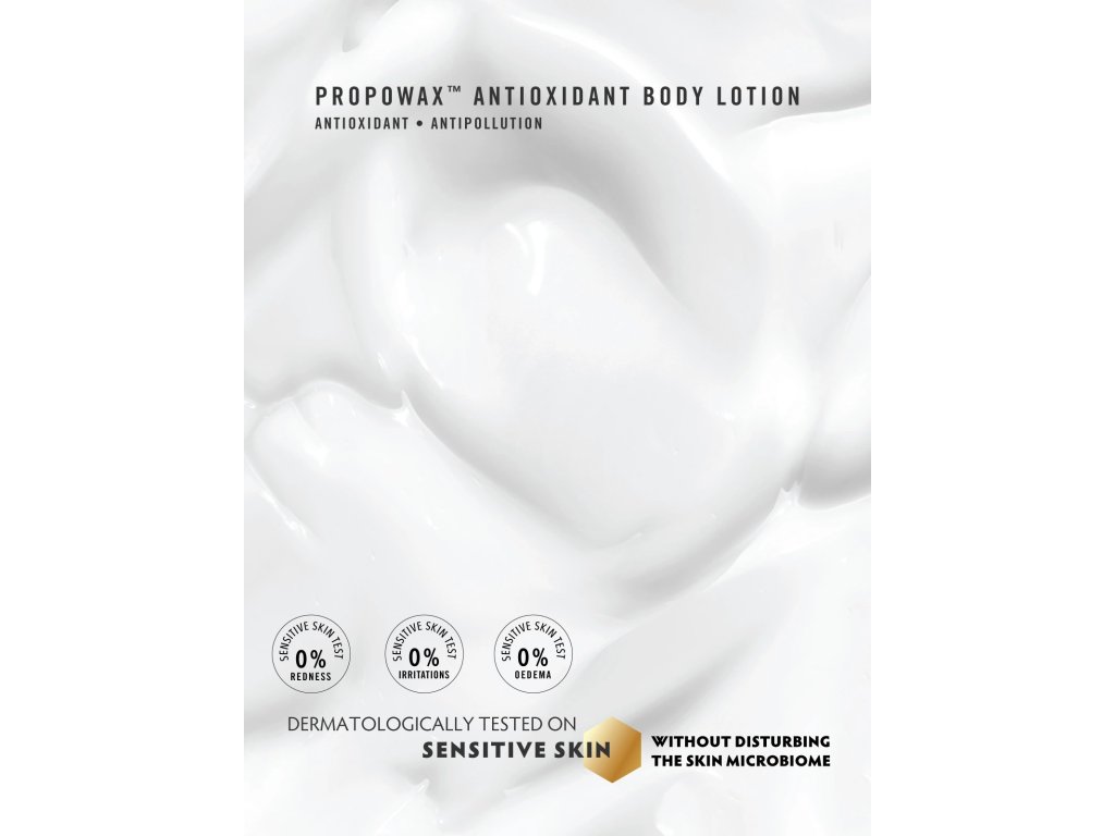 Telové mlieko PROPOWAX™ s antioxidačným účinkom poskytuje hodvábnu hydratáciu spojenú s antioxidačnou silou. Jeho rýchlo sa vstrebávajúca, zamatová textúra zahalí telo do dlhotrvajúcej hebkosti a zároveň chráni pred znečistením, oxidačným stresom a predčasným starnutím. Ideálna na dennú hydratáciu, starostlivosť po opaľovaní, zimné zahalenie a dynamický moderný životný štýl, zanecháva pokožku pružnú, žiarivú a naplnenú eleganciou jemnej vône.