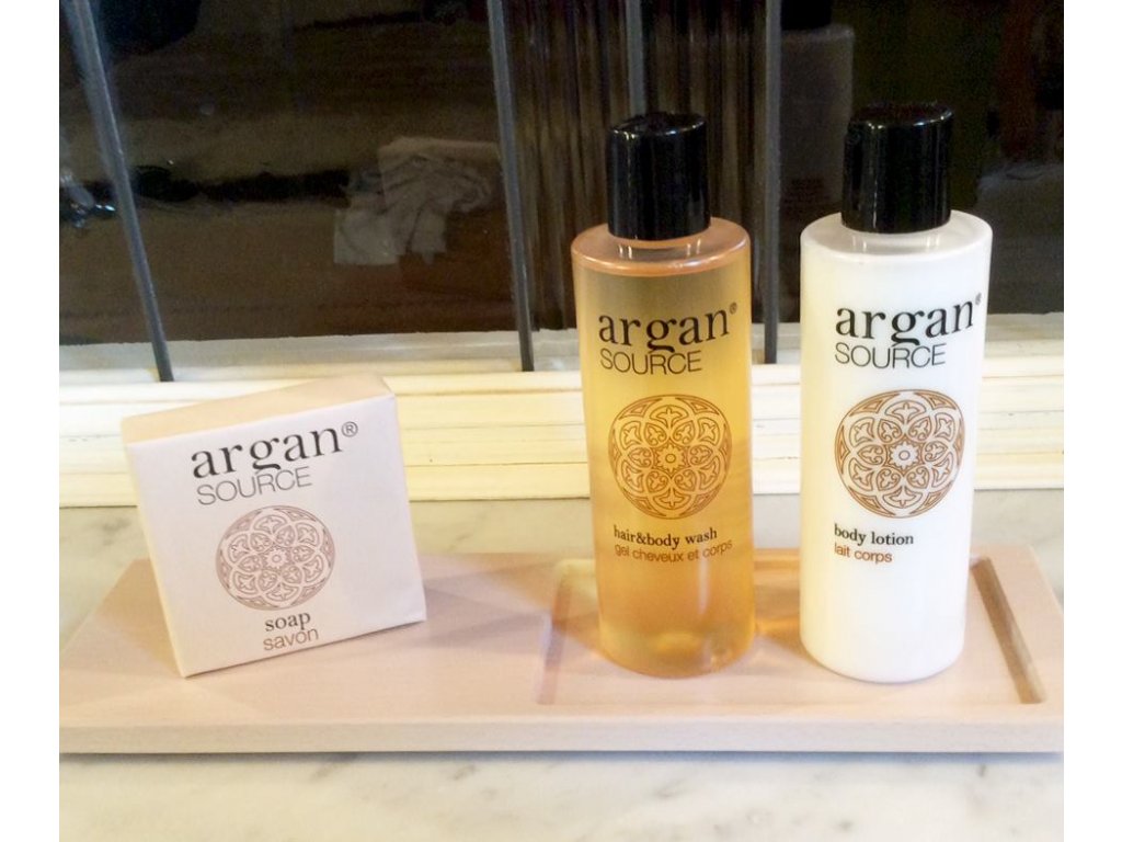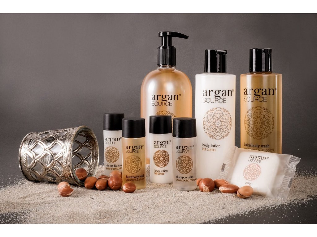 Argan Source je kozmetický rad, ktorý obsahuje všetky výhody organického arganového oleja, vzácnej zložky schopnej dodať pokožke výživu a pohodu vďaka svojim antioxidačným, zmäkčujúcim a hydratačným vlastnostiam. Argan Source je kolekcia, ktorá so svojou hrejivou a obklopujúcou estetikou bola vytvorená s cieľom poskytnúť hosťom intenzívny a relaxačný zážitok z pohody, ktorý je ešte jedinečnejší vďaka rafinovanej vôni, v ktorej sa snúbi sviežosť bergamotu a mandarínky so sladkosťou ľalie. údolia, pivonka a ruža. Čuchový zážitok je dokončený vďaka spojeniu s obklopujúcimi tónmi santalového dreva, ambry a pižma, ktoré dodávajú elegancii vône nádych tajomstva a šarmu.