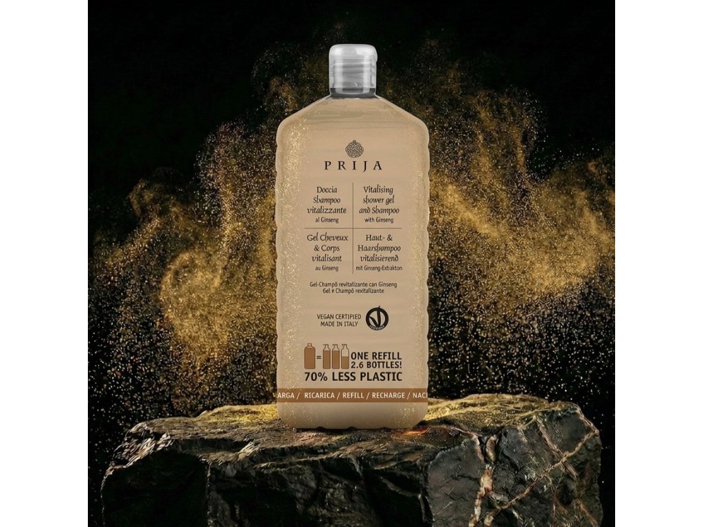 Revitalizačný Gél na telo a vlasy so ženšenom. Jemne čistí pokožku a pokožku hlavy s omamnou vôňou Prija a zanecháva okamžitý pocit vitality a pohody po celom tele. Obohatený o extrakt zo ženšenu. Osviežujúce vlastnosti rastliny ženšenu sú na Východe známe už mnoho storočí. Extrakty z jej koreňov majú osviežujúce a revitalizačné účinky na kožu.