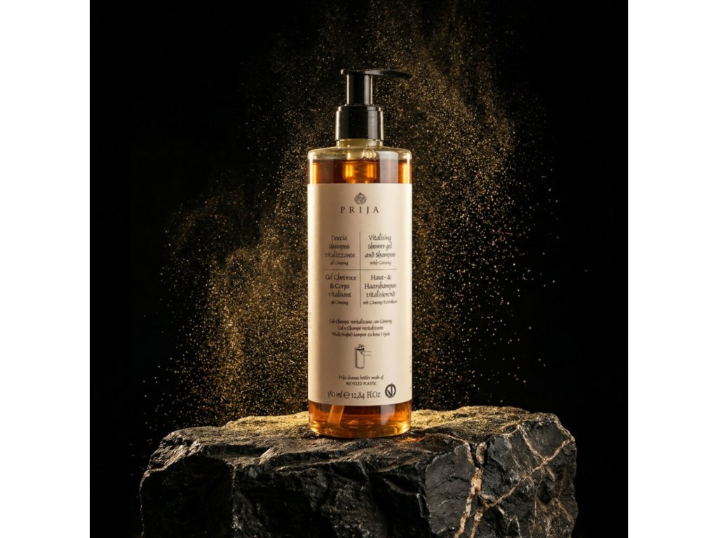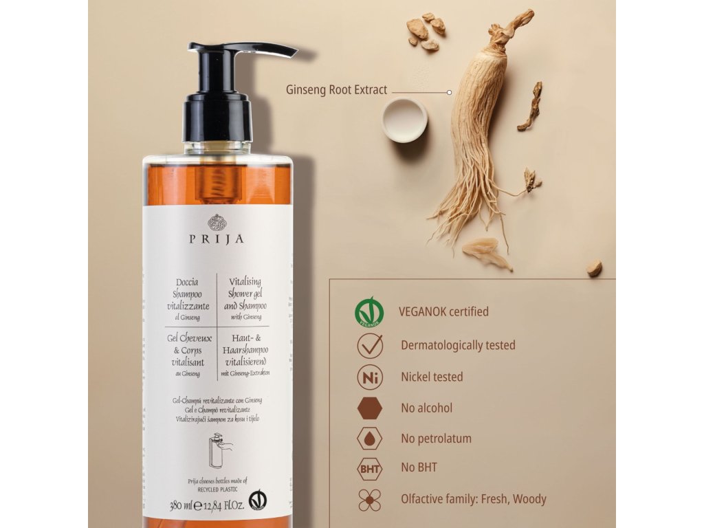 Revitalizačný Gél na telo a vlasy so ženšenom. Jemne čistí pokožku a pokožku hlavy s omamnou vôňou Prija a zanecháva okamžitý pocit vitality a pohody po celom tele. Obohatený o extrakt zo ženšenu. Osviežujúce vlastnosti rastliny ženšenu sú na Východe známe už mnoho storočí. Extrakty z jej koreňov majú osviežujúce a revitalizačné účinky na kožu.
