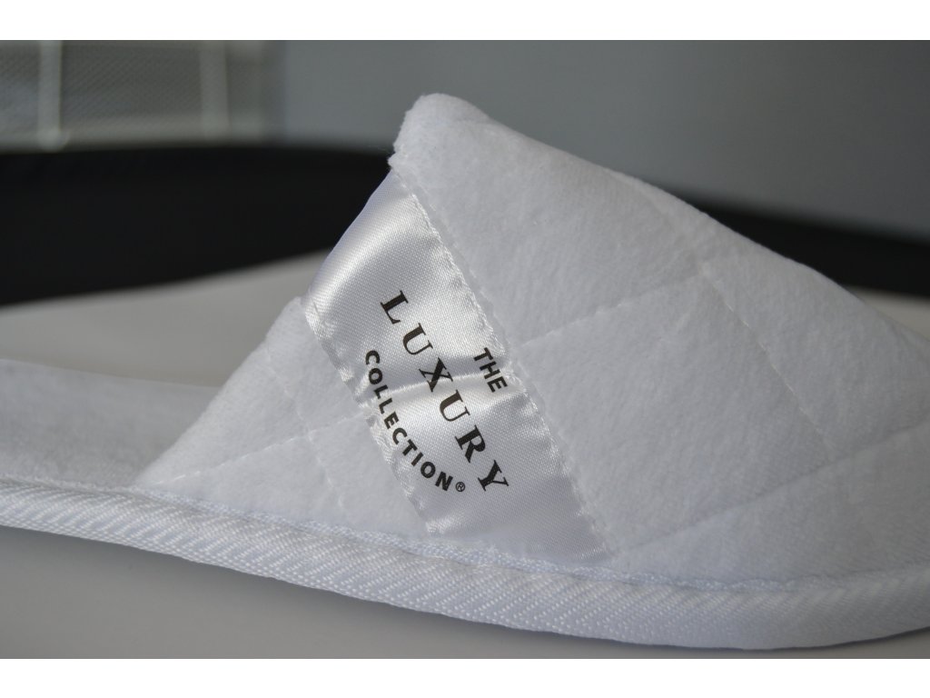 Papuče LUXURY COLLECTION pre náročných klientov a hotely, ktoré chcú zanechať dojem nadštandardu. Podrážka je z 5mm hrubého EVA materiálu, vhodného na všetky typy podláh, s protišmykovou úpravou. Dodávané sú vo veľkosti 28 cm, avšak môžu byť plne personalizované, vrátane vyšívaného alebo tlačeného loga. Dodávané sú v kartóne po 100 kusov, každý pár je oddelený v samostatnom hygienickom sáčku.