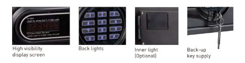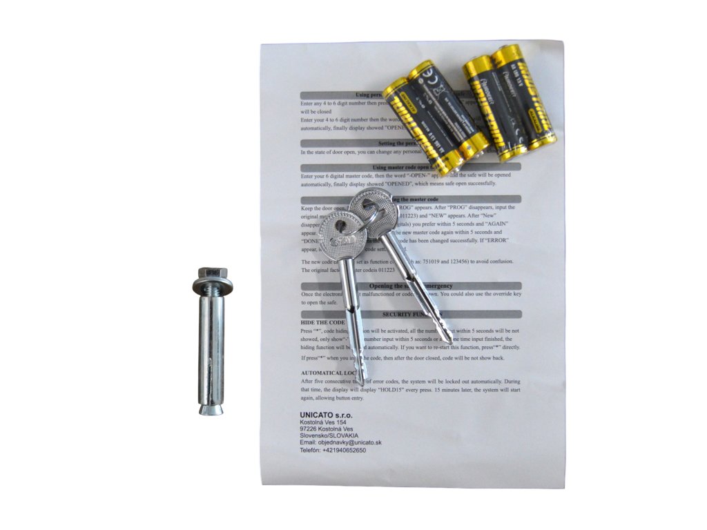 Súčasťou balenia trezoru sú 4xAA batérie, 2x servisný kľúč, 4x inštalačné skrutky, návod na použitie.