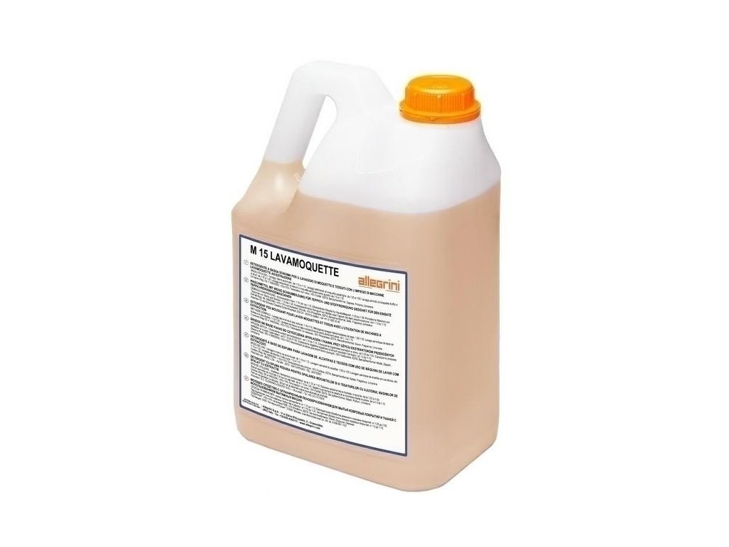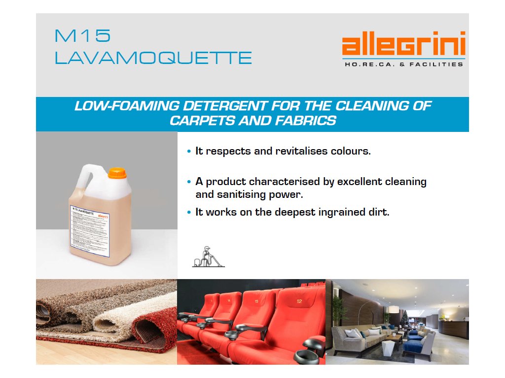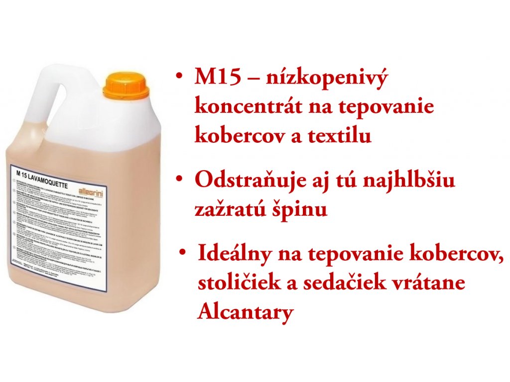 POUŽITIE: M15 LAVAMOQUETTE je špeciálny nízko penivý koncentrát na čistenie kobercov a rôznych druhov textilu. Má vynikajúcu čistiacu a dezinfekčnú silu a funguje aj na najhlbšiu zažratú špinu. Rešpektuje a revitalizuje prirodzenú farbu textilu. M15 je špeciálne vyvinutý na používanie s tepovacími vysávacími strojmi. Ideálne na čistenie sedačiek, kresiel, kobercov a na podobné čalúnené povrchy vrátane zamatu a Alcantary.