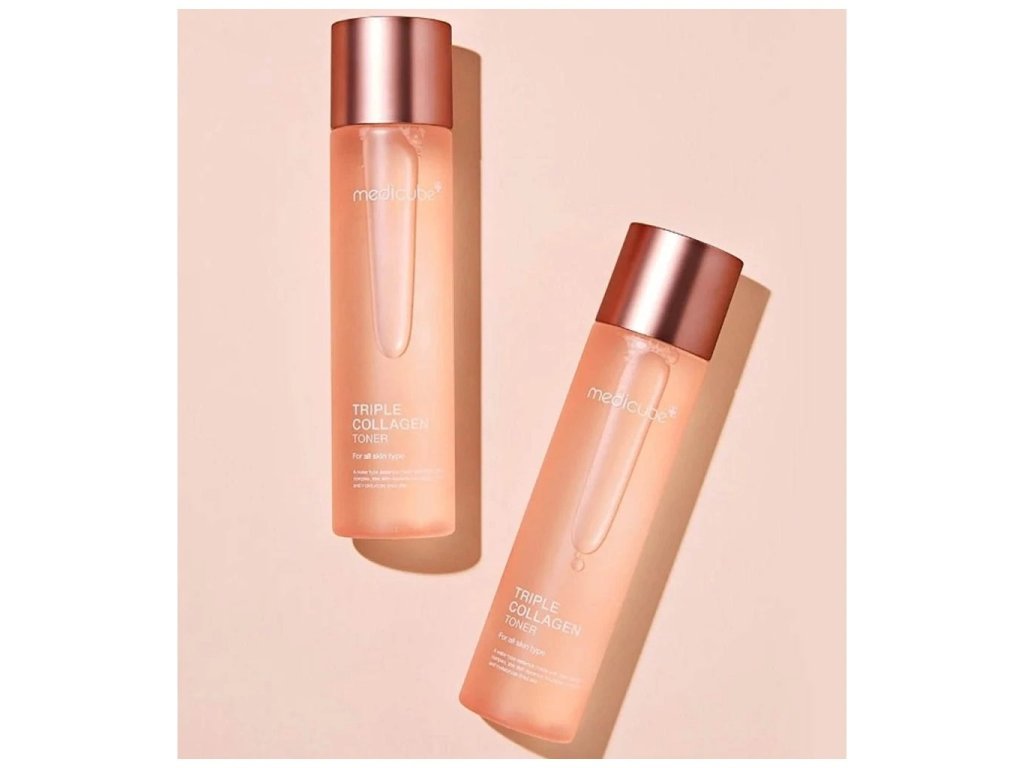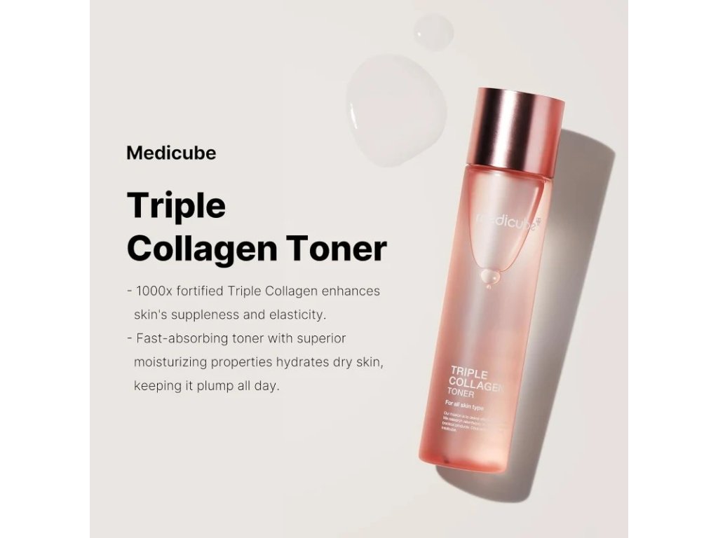 MEDICUBE Triple Collagen Toner - Omladzujúci toner s kolagénom zlepšuje elasticitu pokožky a zároveň hydratuje ochabnutú pleť bez pružnosti. Vďaka obsahu trojitého kolagénu s 1000-násobne vyššou silou - hydrolyzovaný kolagén, atelo kolagén a rozpustný kolagén - sa zameriava na omladenie a zlepšenie stavu pleti.