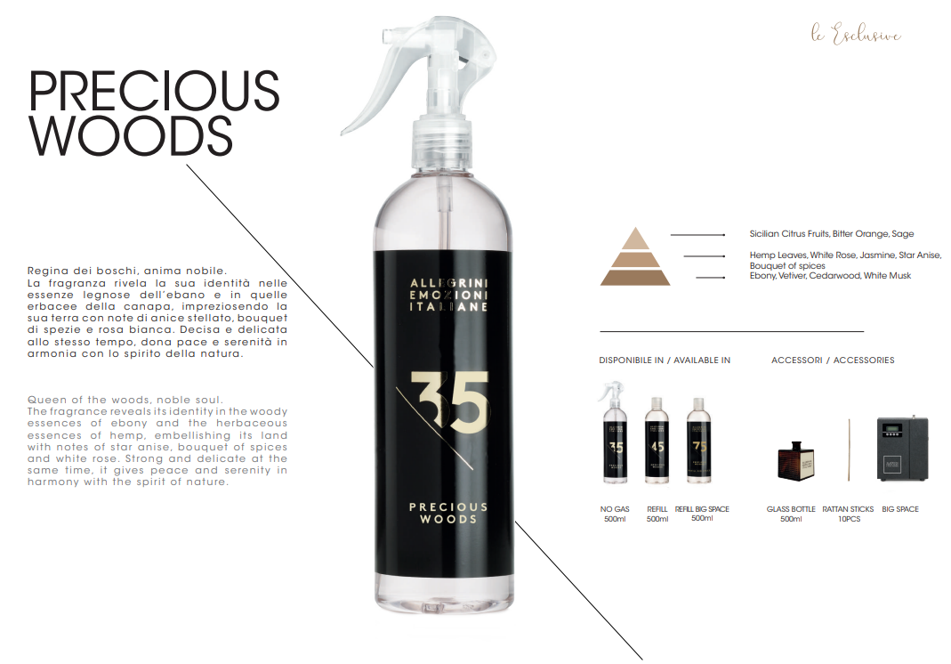 PRECIOUS WOODS - Kráľovná lesa, ušľachtilá duša. Vôňa odhaľuje svoju identitu prostredníctvom drevitých esencií ebenu a trávnatých vôní konope, ktoré obohacujú o tóny badiánu, kyticu korenia a bielu ružu. Zároveň rozhodná a jemná, podporuje pokoj a vyrovnanosť v harmónii s duchom prírody.