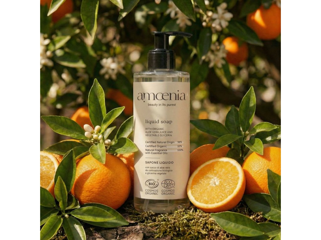 Tekuté mydlo AMOENIA s pumpičkovým dávkovačom je ideálny produkt na vyživovanie pokožky rúk, je jemné a voňavé vďaka prítomnosti organického aloe