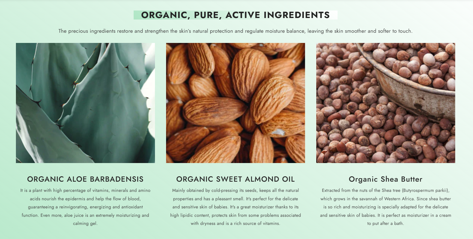 Dlhotrvajúci hydratačný krém zabraňuje poškodeniu spôsobenému suchosťou a zanecháva pokožku jemnú. Toto jemné zloženie je vhodné pre citlivú pokožku bábätiek a batoliat, obzvlášť vystavenú vonkajším agresívnym vplyvom a podráždeniu; obnovuje hydrolipidický film na povrchu pokožky. Posilňuje elasticitu a pružnosť pokožky vďaka vysokému obsahu lipidov bambuckého masla a sladkého mandľového oleja z ekologického poľnohospodárstva. Certifikovaný organický* výživný krém s jemnou vôňou mandlí, medu a ruže.