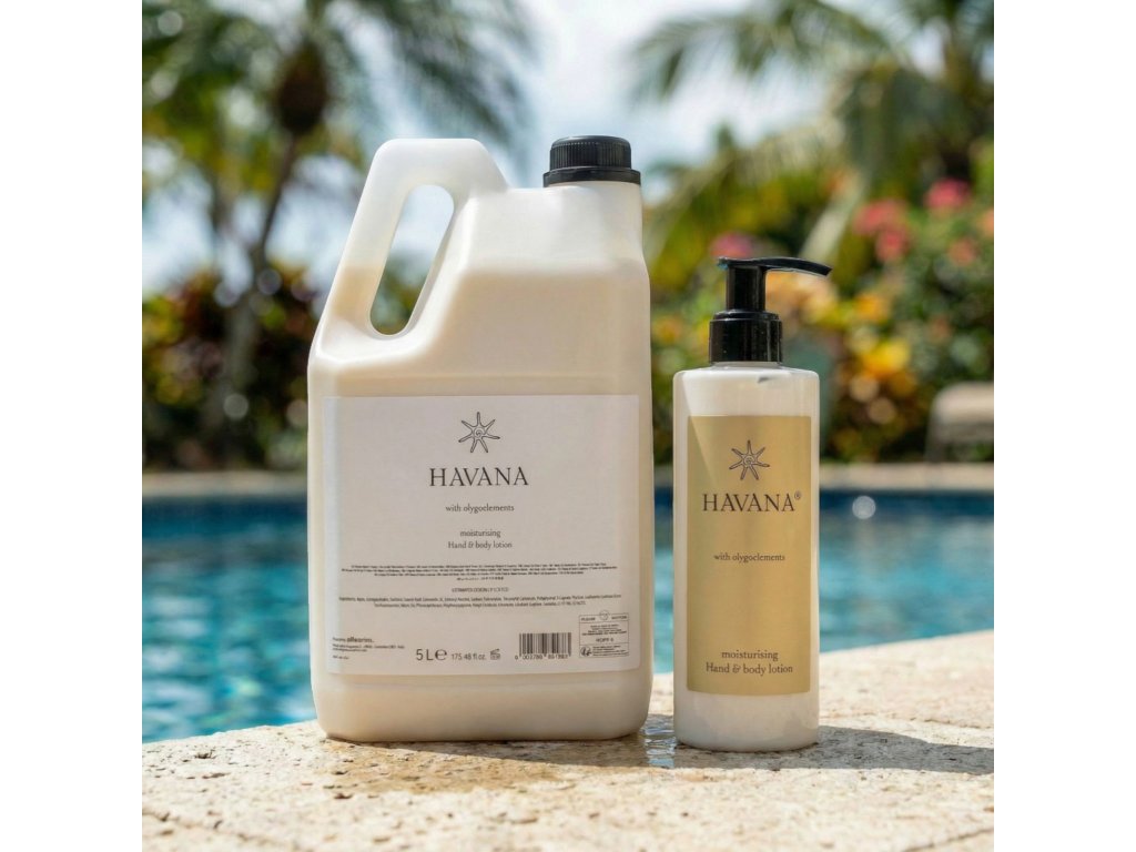 HAVANA: hotelová kozmetika inšpirovaná thalassoterapiou.Havana so svojou osviežujúcou a zdravou vôňou inšpirovanou thalassoterapiou, sa skladá z produktov na boj proti stresu a únave. Všetky výhody terapie, ktorá siaha až do staroveku, sú obsiahnuté v koncentráte olygoelementov, vysoko hydratujúcom a remineralizujúcom. Jej osobitná vôňa vyzýva k mysleniu koloniálnych vôní, čo robí z Havany úžasnú líniu s exotickými odkazmi.